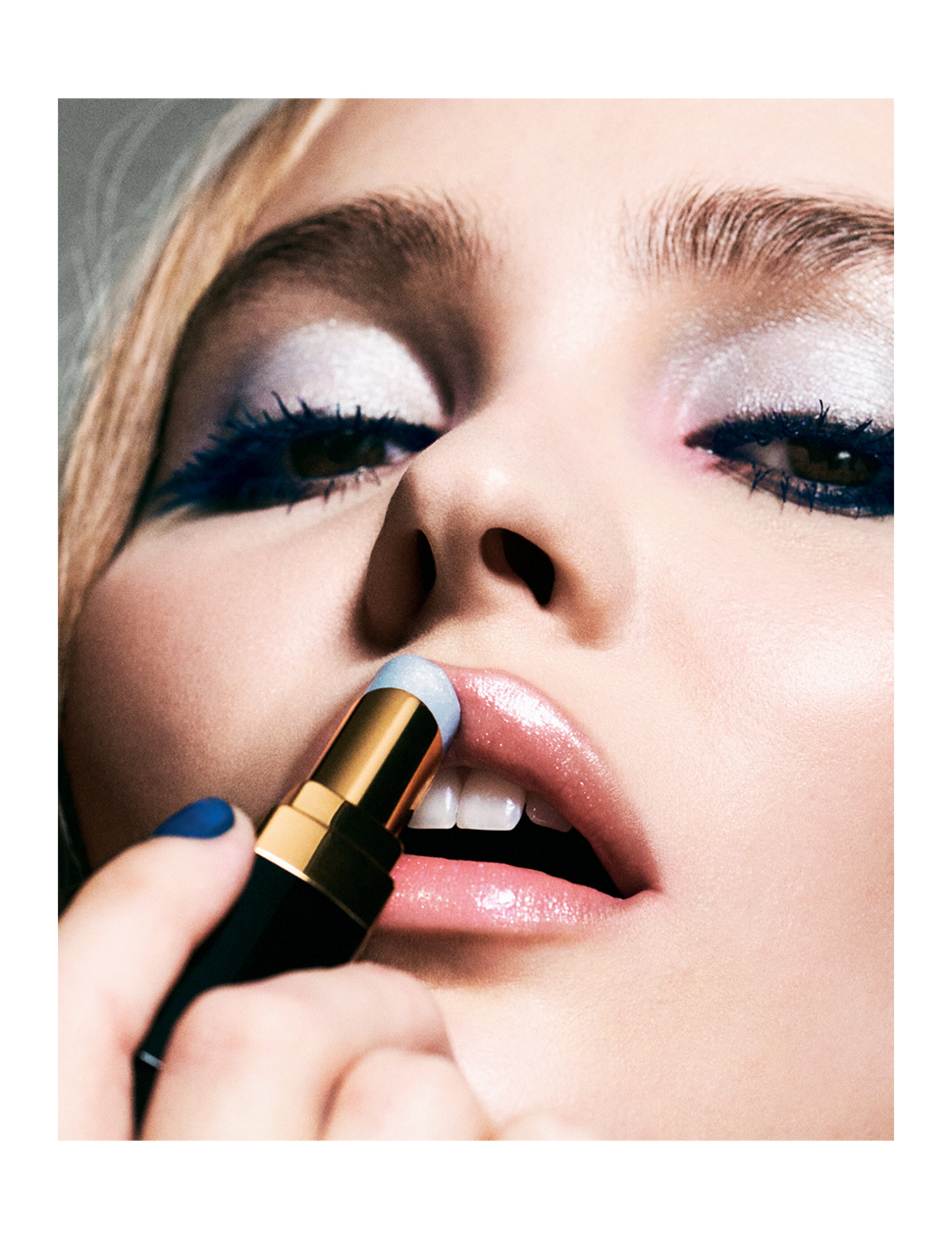 A quartet of blues, platinum and pink, Les 4 Ombres eyeshadow palette in Denim Dream wears like a custom denim wash for the eyes. “Satin and shimmer finishes catch the light differently, creating depth and dimension, while matte tones provide structure and intensity,” explains Li.